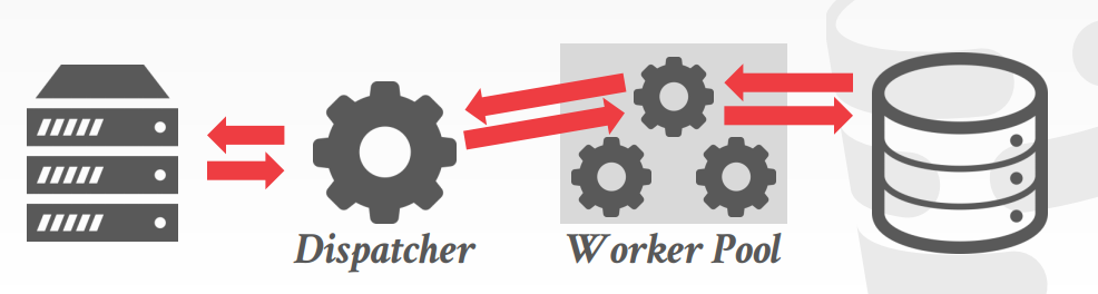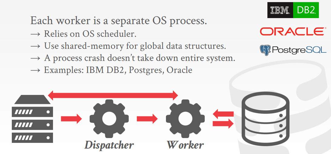 数据库每次收到请求,由任务分发器Dispatcher创建新的Worker进程负责处理该请求。由于每个请求都具有自己的地址空间,可能会造成同一页在多个进程中拥有重复副本,可以通过共享内存避免重复副本。同时,这种模型不会因为一个worker崩溃而导致其他worker崩溃。