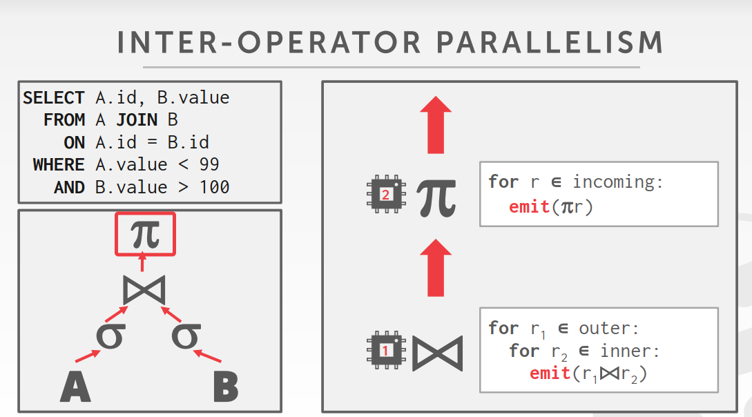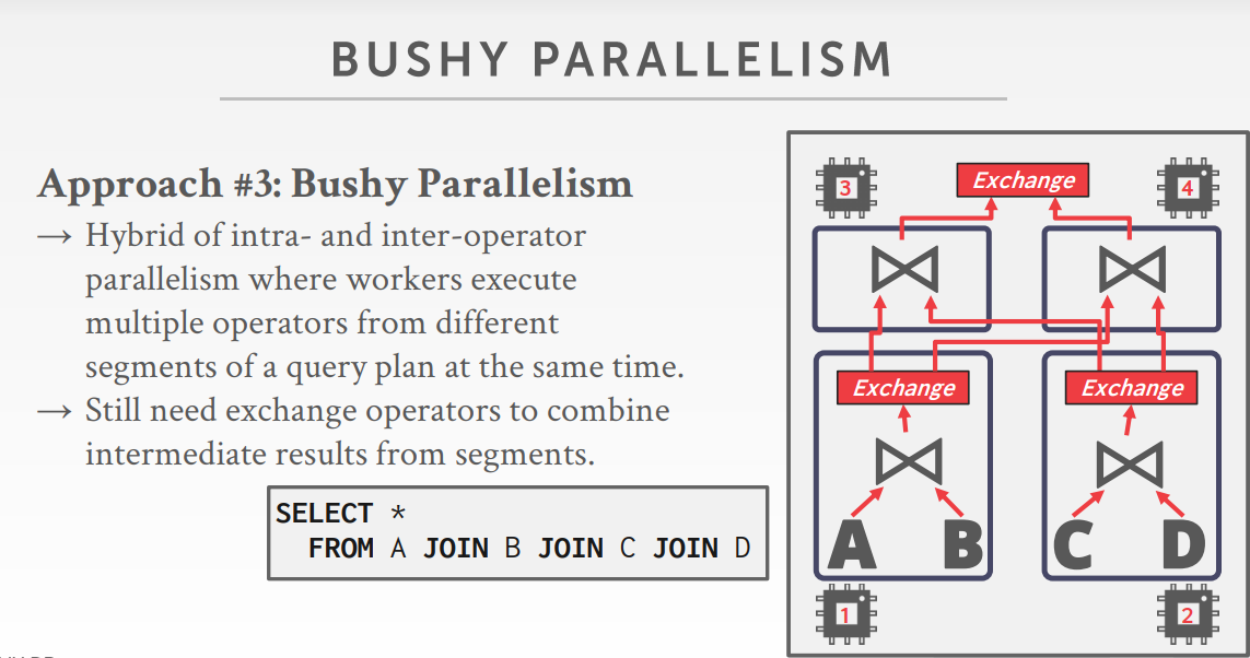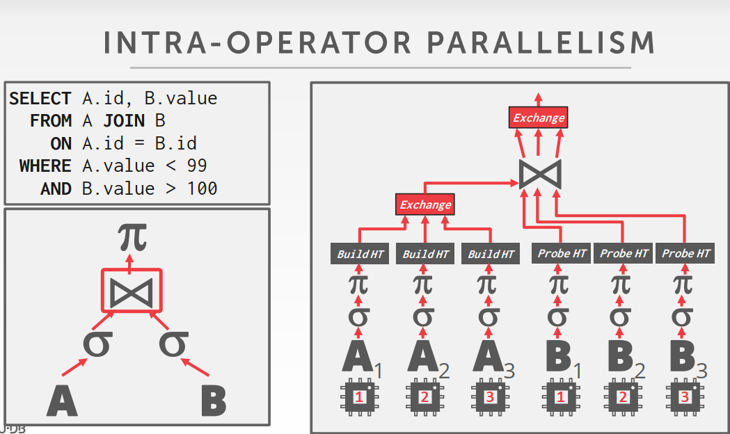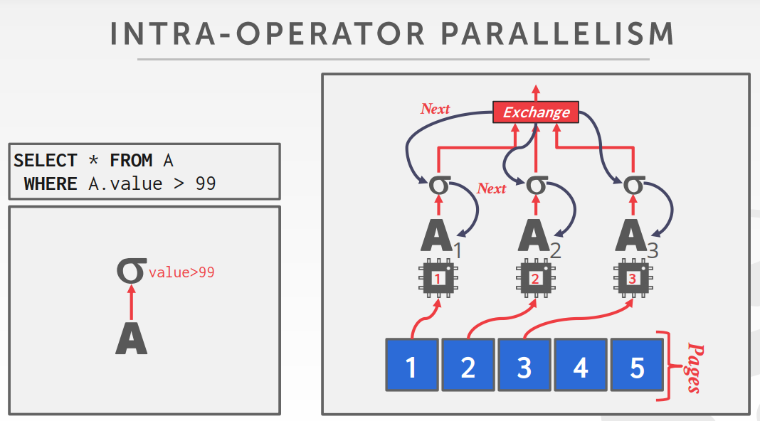将一个任务(操作符)划分成多个独立的分段,由多个线程分别处理。DBMS会在查询计划中插入一个exchange操作,将执行完的分段合并起来。