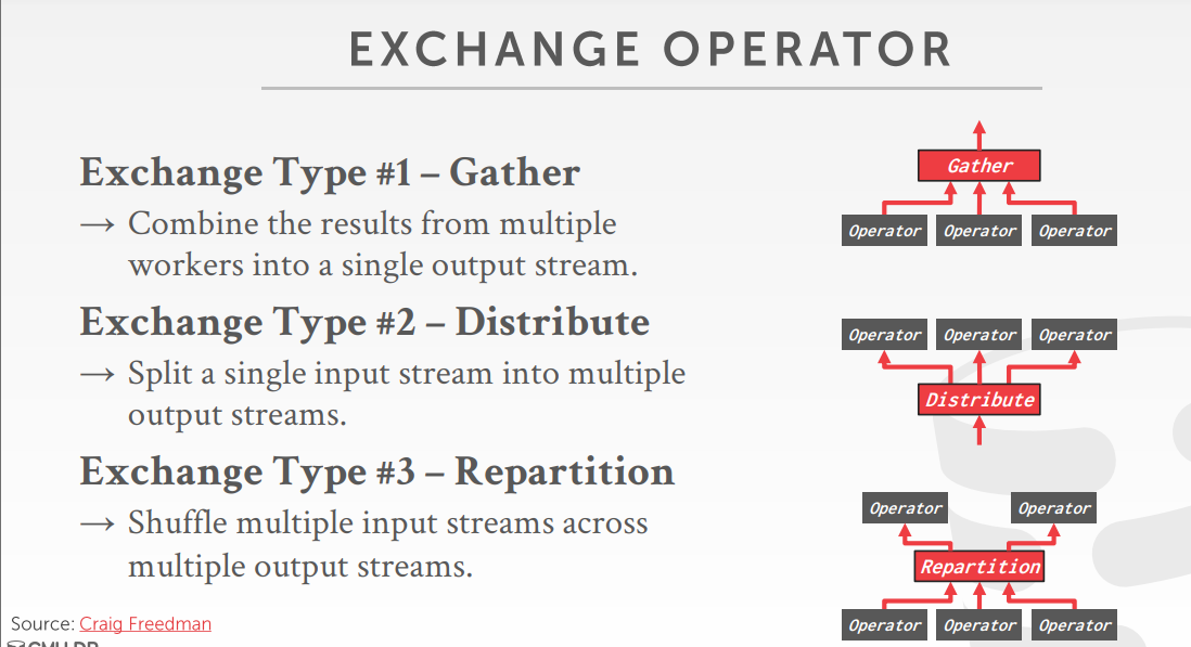 Exchange操作符有三种类型:Gather, Repartition, Distribute