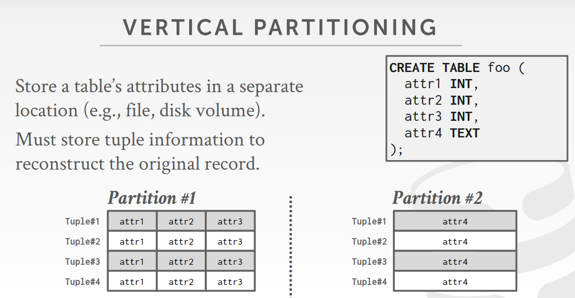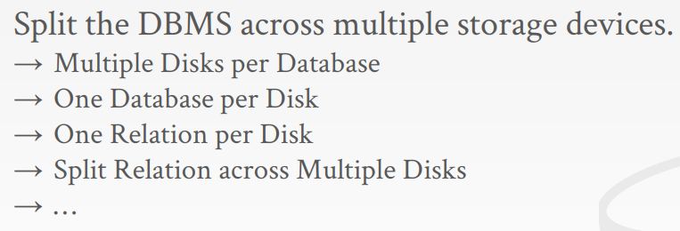 将数据库中的数据拆分为不相交的集合,然后将它们分配给离散的磁盘。DBMS可以指定每个数据库在磁盘上的存储位置。