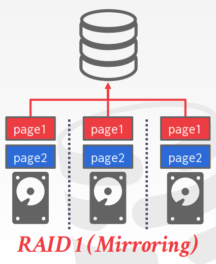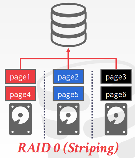 器在多个磁盘中存取数据,RAID控制中保存元数据,告诉某一页位于哪个磁盘中。