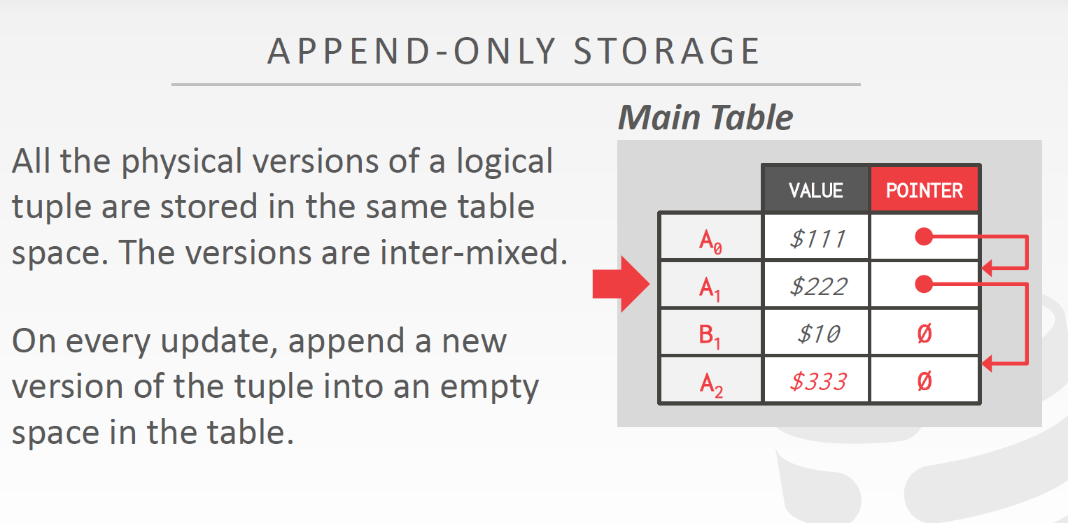 DBMS维护一张主表,主表的每一行保存了所有元组版本,同一个元组的版本通过指针连接在一起。每次对一个元组进行修改时,都将新版本加入到主表的末尾,并将上一个版本的指针域指向它。