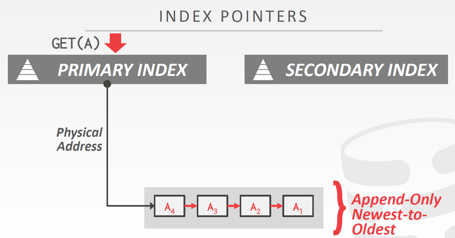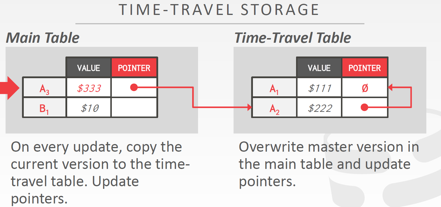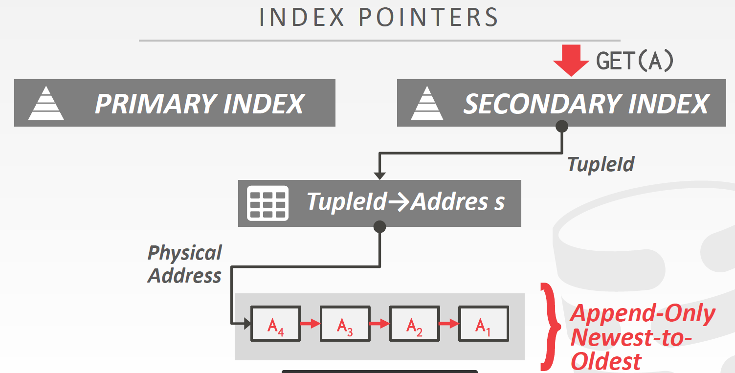 Main Table只保存各个元组最新版本,所有元组的旧版本被放到Time-Travel Table中,并以Newest-to-Oldest的顺序链接。Main Table中最新版本的指针指向Time-Travel Table中对应旧版本链表的表头。