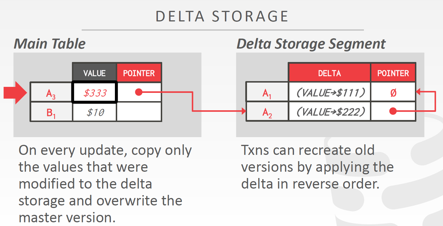 MySQL和ORACLE采用这种方法,写入时开销更小,但恢复较慢。由Main Table和Delta Storage Segment两张表组成。总体思路和Time-Travel Storage差不多,但Delta Storage记录的是每个版本对哪些字段上的值进行了什么样修改,而不是整个元组。需要恢复到某个版本时,找到该版本所做的修改,然后重新执行操作即可。