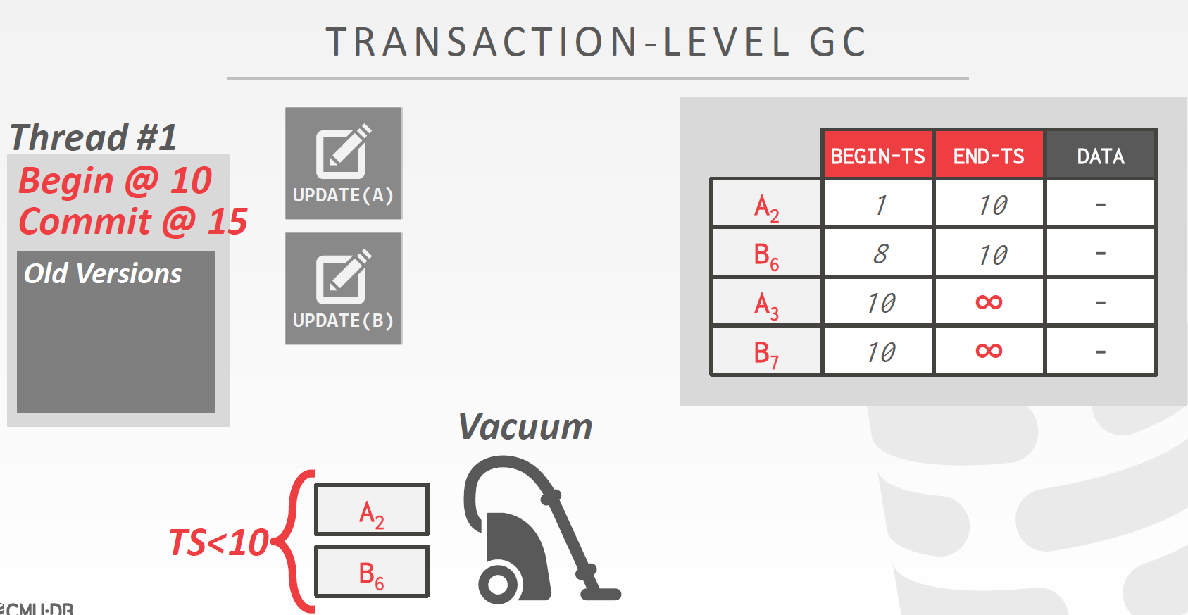 事务会维护自己的read/write set。当一个事务提交后,DBMS会检查该事务创建的所有版本,并将那些不可能再被看见的版本删除。